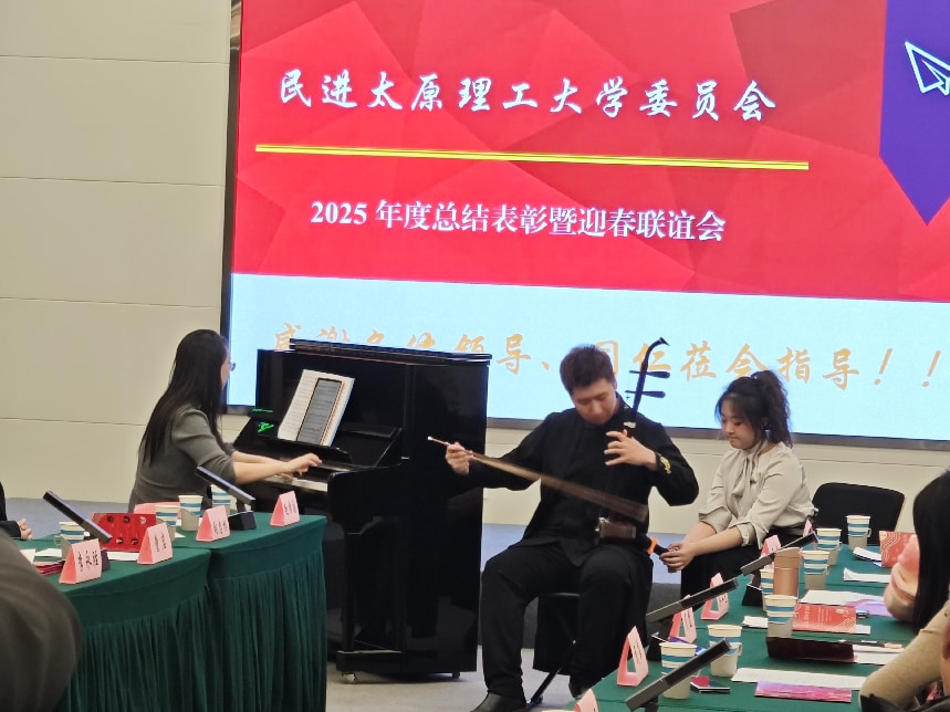 大会第一阶段议程结束后,民进太原理工大学委员会“2026新年音乐会”精彩启幕。校民进艺术团精心编排的11个节目轮番登场,钢琴四手联弹串烧节奏明快、激昂奋进,二胡独奏《阳光照耀着塔什库尔干》旋律悠扬、婉转深情,女声独唱《英雄赞歌》《亲吻祖国》饱含热忱、催人奋进,古筝、竹笛、手风琴等多种乐器演奏精彩纷呈,充分展现了民进会员的多元才华与深厚家国情怀,将联谊会的热烈氛围推向高潮。